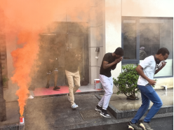 警報響起后,火災(zāi)疏散逃生演練正式開始。確認火情后,啟動學院火災(zāi)疏散逃生演練方案,消防員第一時間關(guān)閉電源使用滅火器進行滅火,國際學生在引導員指引下按照疏散線路進行有序撤離,火情完全撲滅后,演練順利完成。